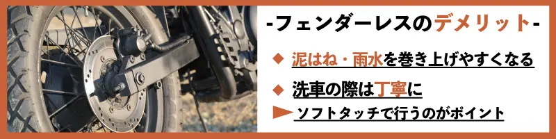 またフェンダーレス化によって、雨水がバイク後部全体に付着、走行後に雨水が乾燥すると泥・小石などが残り、放置するとサビなどの原因となるでしょう。