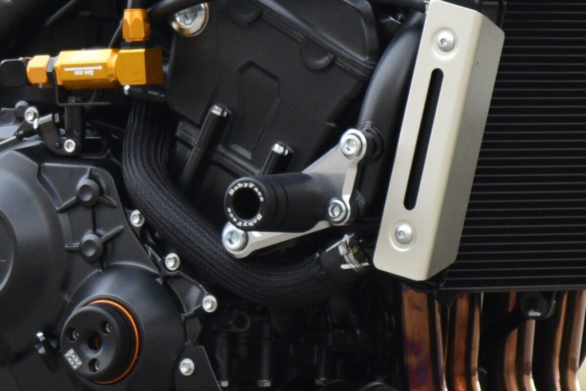 フレームスライダーは、転倒時の衝撃を車体を滑らせることで和らげ、ダメージを軽減する。スライダー素材は、プラスチックの中でもっとも摩擦係数が小さく、優れた耐摩耗性を兼ね備えたジュラコン(ポリアセタール・コポリマー)をNC旋盤で削り出して使用している。