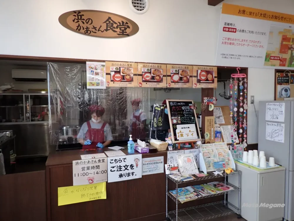 駅舎内には物販で「鹿部・食とうまいもの館」「道の駅のさかな屋」の2店舗、飲食では「浜のかあさん食堂」「こいたのおかず屋」「ソフトクリームショップ」が入る。なお、食堂の営業時間は11時から14時までと短めなので、早い時間が狙い目だ。