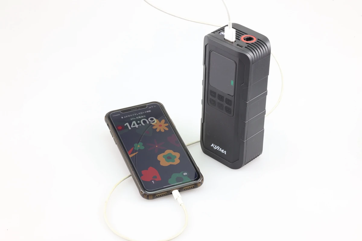 そしてなんと!スマートフォンとかを充電出来る「モバイルバッテリー機能」も搭載されているので「あれ?そういえば愛車の指定空気圧っていくらだっけ?教えてGoogle先生!…って、スマホのバッテリーが切れてて調べられないじゃん、ぴえん…」なんて時はJP03でスマホを充電すればいいんです!
