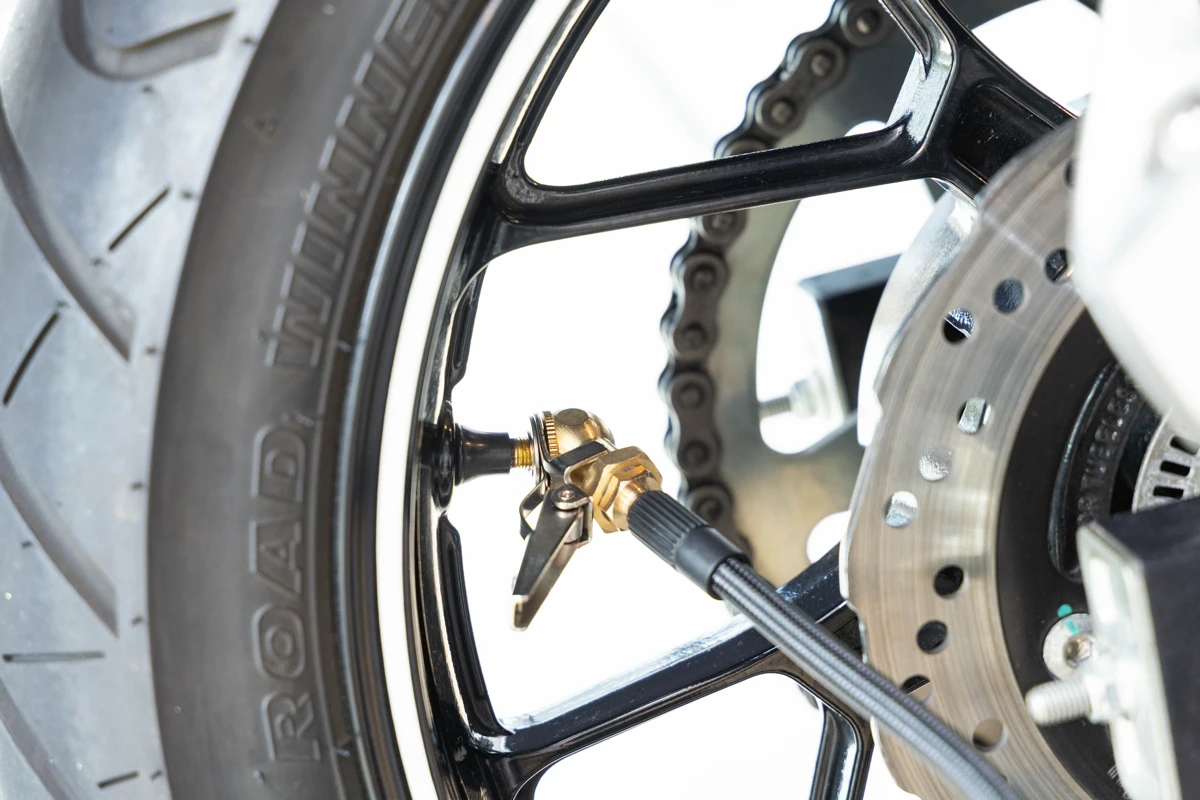 これは一般的なバイクのエアバルブと合致する「米式バルブのオプションアダプター」で、これをホースの先に加えることでエアの注入もエア抜きも行えるようになります。