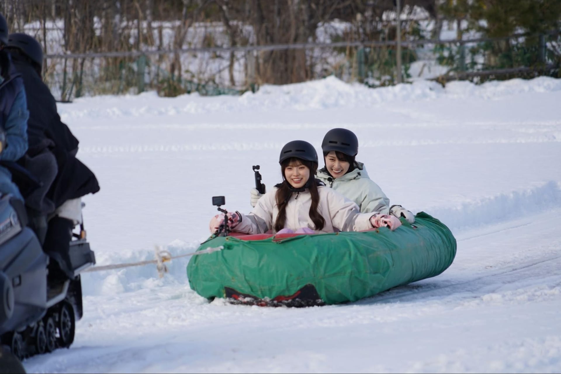 “まほら岩手”でソリ遊びを楽しんだ4期生・賀喜遥香と6期生・森平麗心。次はスノーラフティングに挑戦する。「すごーい!」「うわ~」と言いながら、雪景色のなかスリリングなスピード感を満喫する2人。