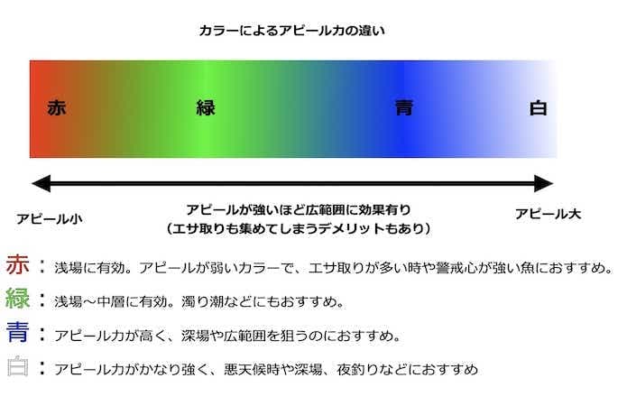 水中では赤→緑→青の順に色が減衰するので、青い集魚灯はアピールが強く、赤い集魚灯はアピールが弱くなります。