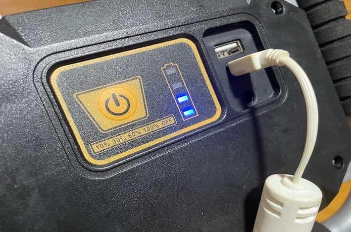 ソーラー充電とAC充電、USB充電ができる三脚付きのLED投光器です。