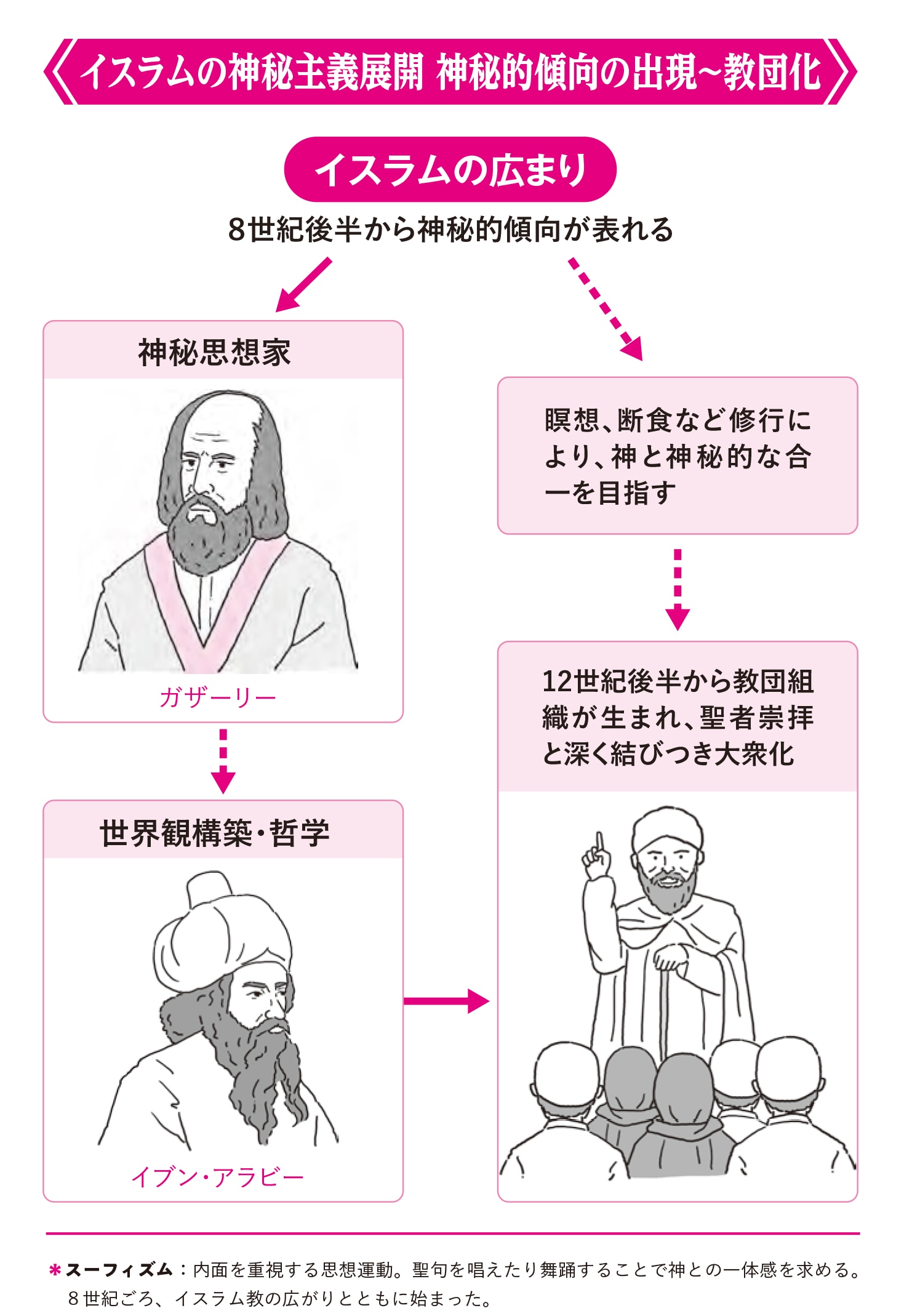 また、オスマン帝国のスンニ派内では、*スーフィズム(神秘主義)が盛んになり、かつての征服者であるモンゴル人まで改宗しました。スーフィズムは、「あらゆるもの、人の心のなかにも神=アッラーは存在する」という考えに基づき、瞑想や修行によって個人のなかに神を実感しようとするものです。