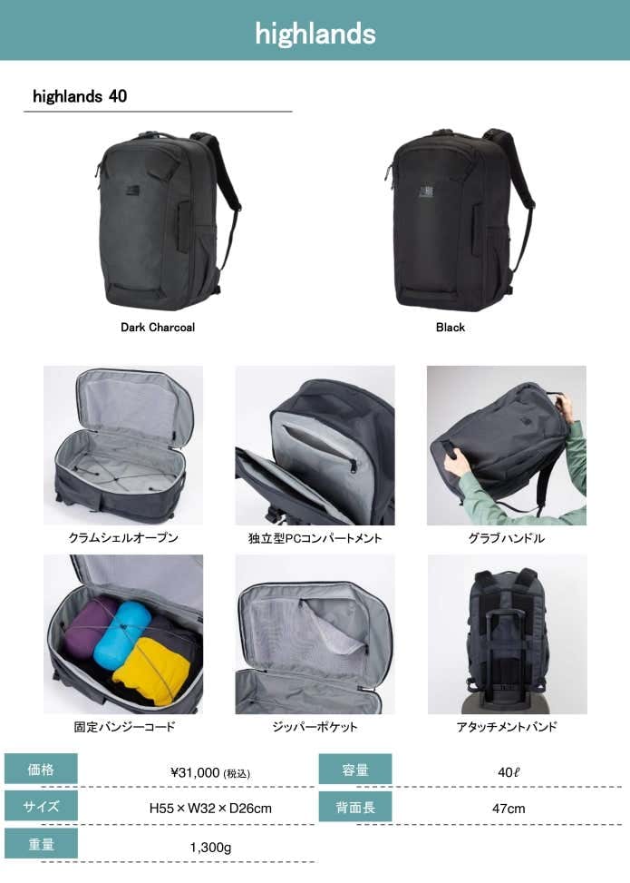 「highlands」は、アウトドア品質の機能性を備えたライフスタイル向けシリーズ。今シーズンから40Lサイズが新たに加わりました。