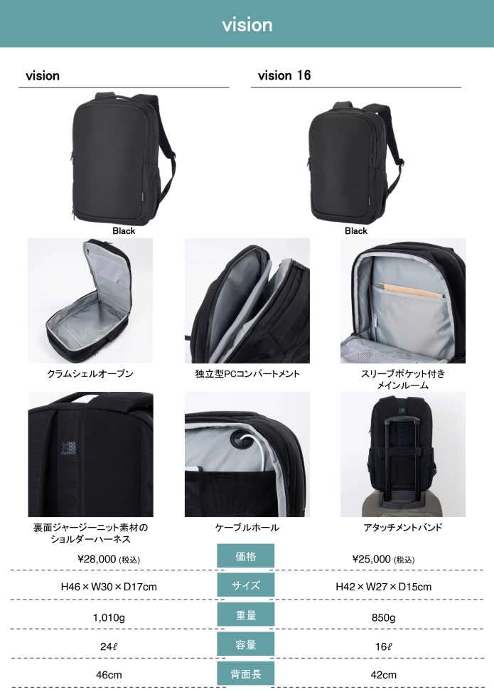 「vision」は、ビジネスシーンに特化した機能性バッグ。登山用リュックの設計を応用したショルダーハーネスにより、荷物が重い日でも肩への負担を軽減します。