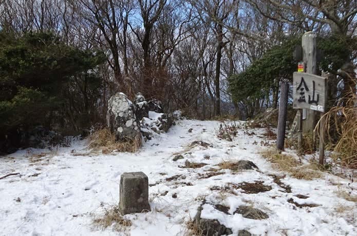 山頂の一等三角点は、しめ縄で囲まれた、まるで相撲の土俵のような珍しい造り。立ち入ることはできませんが、一見の価値があります。