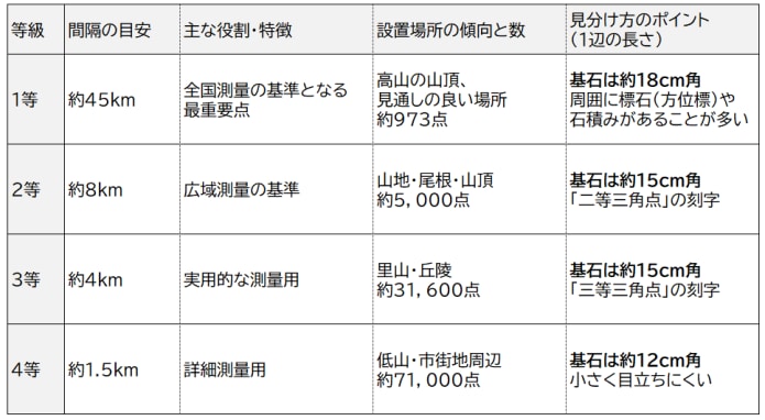三角点は1等から4等までの4種類。役割や見分け方は以下の通りです。