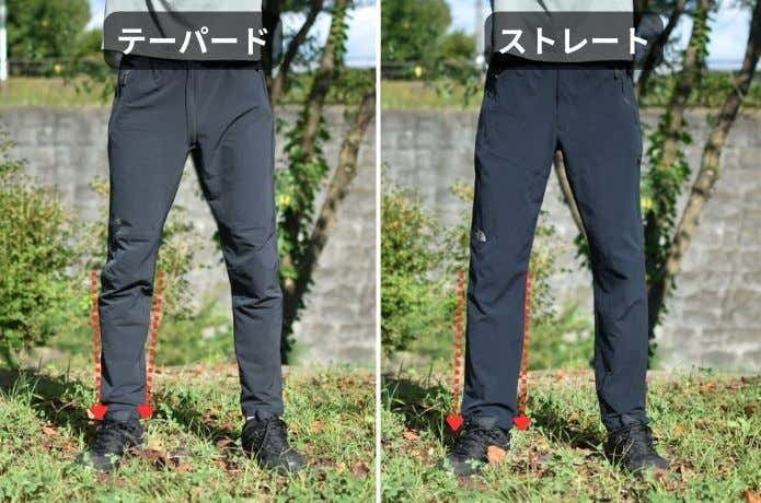 膝から裾に向かって細くなっているのが「テーパード」。裾がばたつかないため、足さばきに優れています。ただ小石などはやや靴に入り込みやすくなります。
