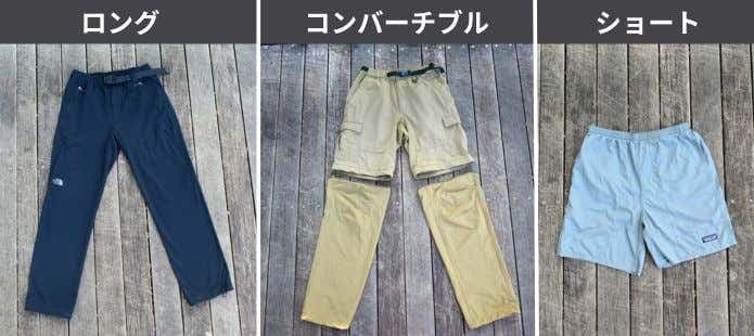パンツには大きく分けてロング・ショート・コンバーチブルの3タイプがあります。最もオールマイティーに使えるのがロングで、涼しさ・軽快さを重視するときに候補となるのがショート。両者のいい所取りがコンバーチブルです。