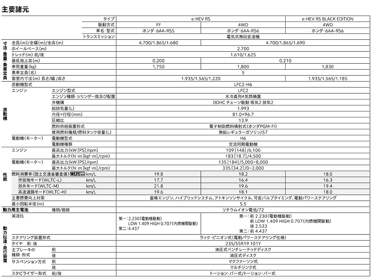 パワーユニットにはLFC2型2.0Lのガソリンエンジン(148ps/183Nm)に2基のモーター/ジェネレーターを組み合わせたハイブリッドシステム「e:HEV」を採用。WLTCモードの燃費は、RSのFF車が19.8km/L、同4WD車が18.2km/L、RSブラックエディションが18.0km/Lとなっている。
