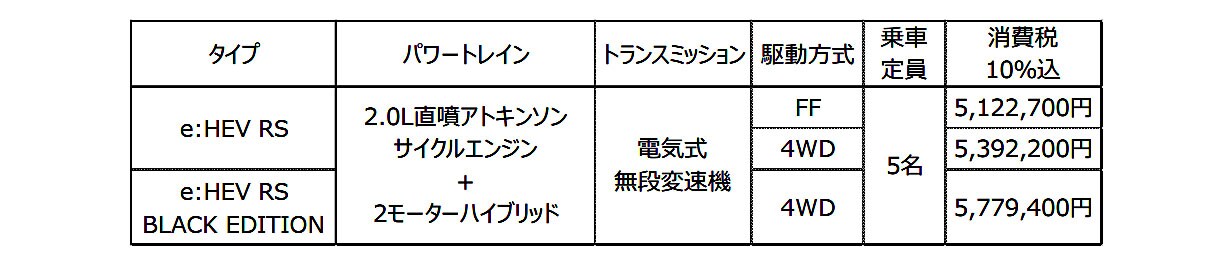 日本市場でのラインナップは、スポーティな「e:HEV RS」と、日本専用の上級グレード「e:HEV RSブラックエディション」の2種類で、「e:HEV RS」にはFFと4WDを用意。「e:HEV RSブラックエディション」は4WDのみの設定となっている。
