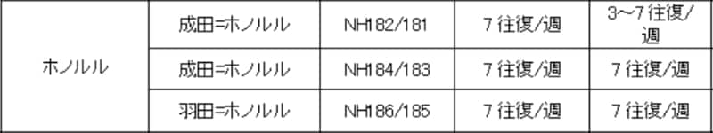 成田~ホノルル線(NH182/181)の期間減便スケジュール
