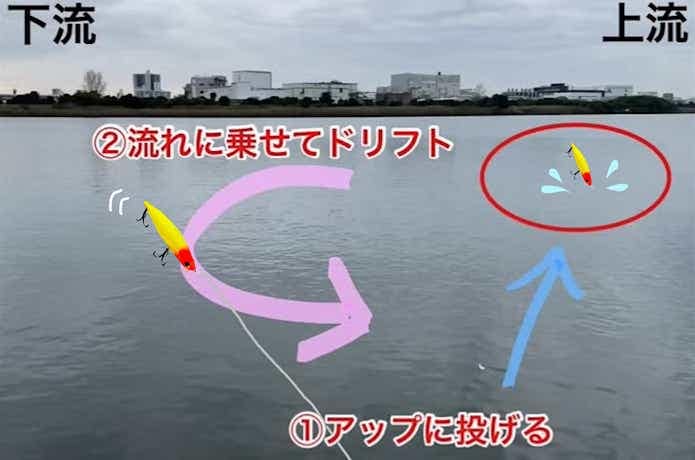 流れのアップに投げてラインスラッグをとりながら自然に流すことで、まるで本物のベイトが流れているような動きを再現できます。