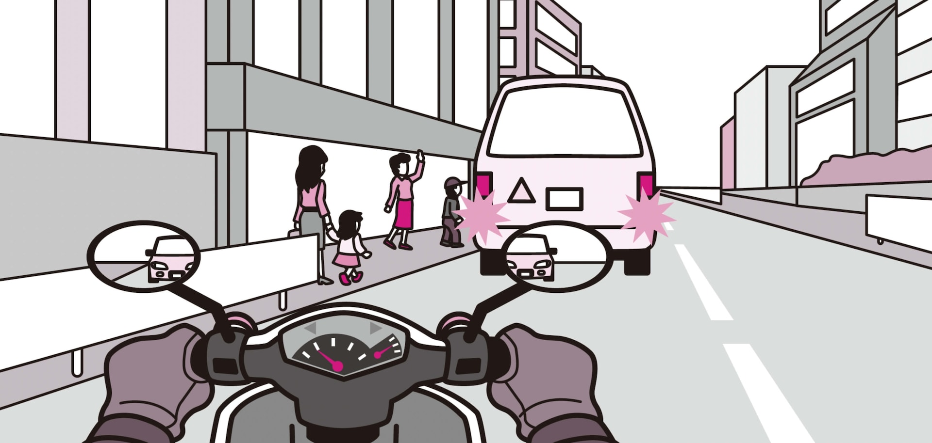 ここに注目!乗降中の子どもに注目。また、バスのかげで対向車の有無も確認できません。