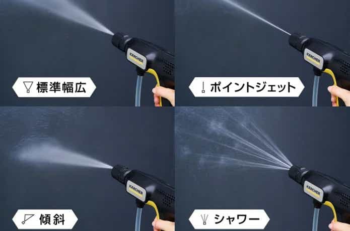さらに、ノズル先端を切り替えることで「標準幅広」「ポイントジェット」「傾斜」「シャワー」の4パターンに対応。シーンに合わせて自在に使い分けられます。