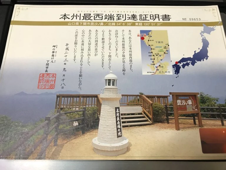 あ、ひとつ大切なことを言い忘れていましたが…端っこスポット定番の「到達証明書」の件ですが…これは毘沙ノ鼻に立ち寄った後に「下関駅観光案内所・新下関駅観光案内所・観光情報発信ターミナル・下関観光コンベンション協会」のいずれかの場所に行くと、たった100円で発行してもらえますので是非!
