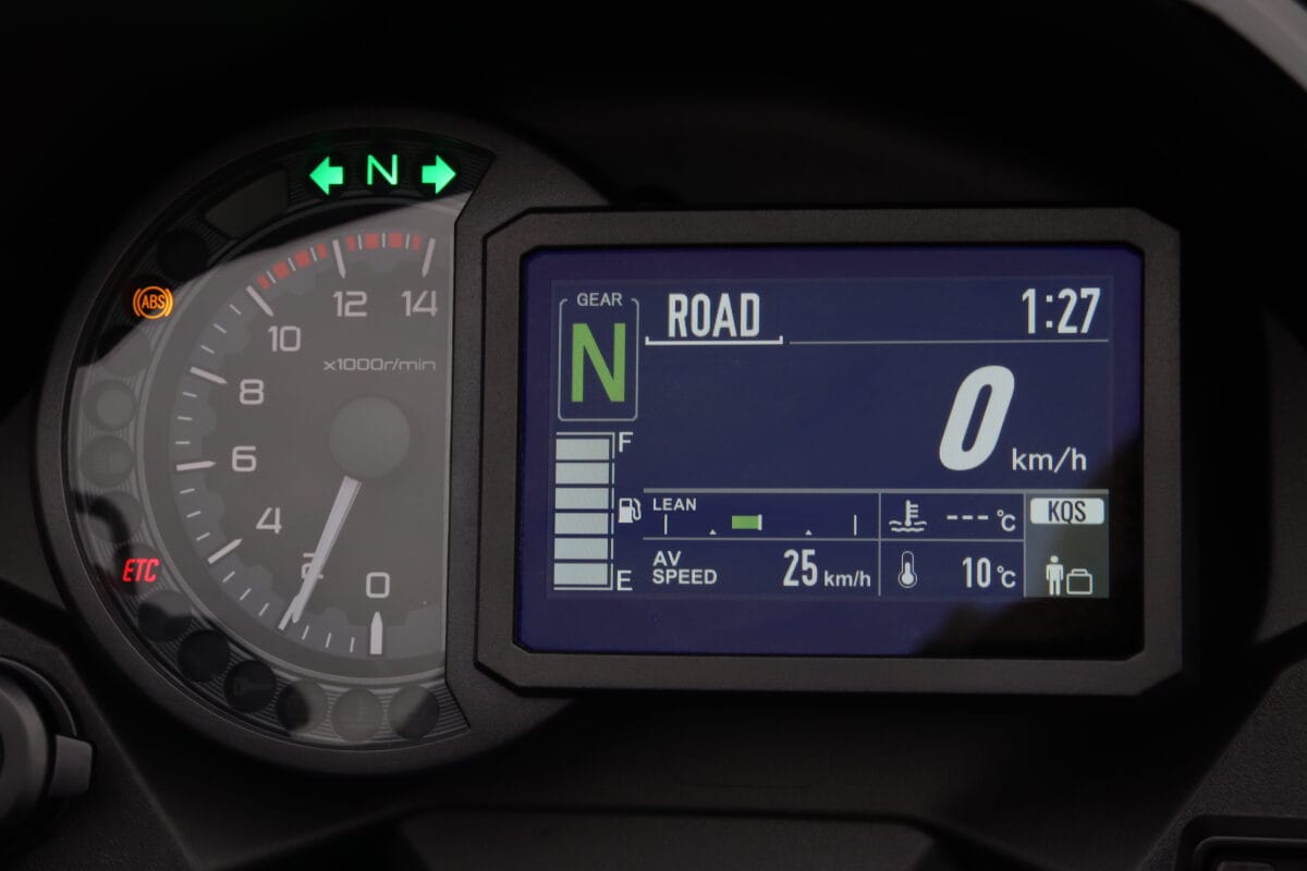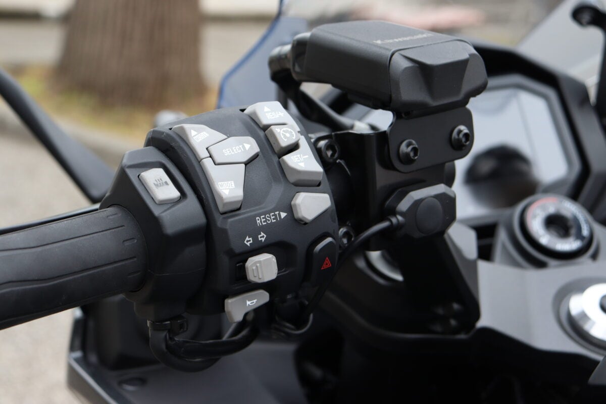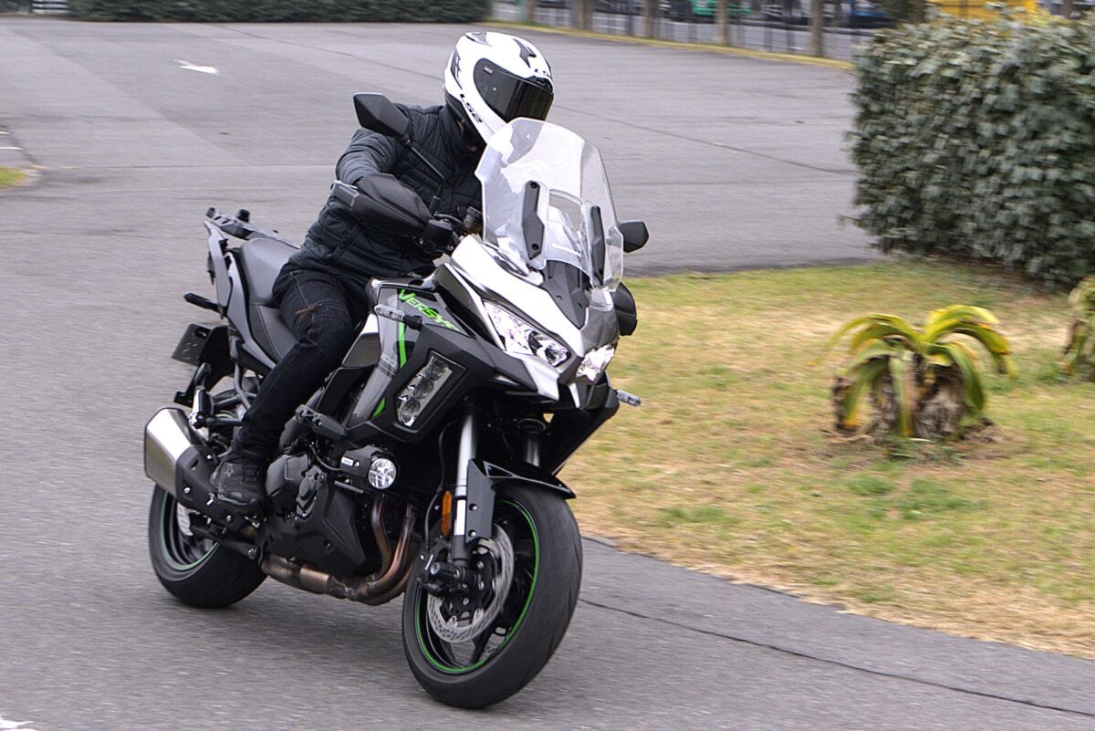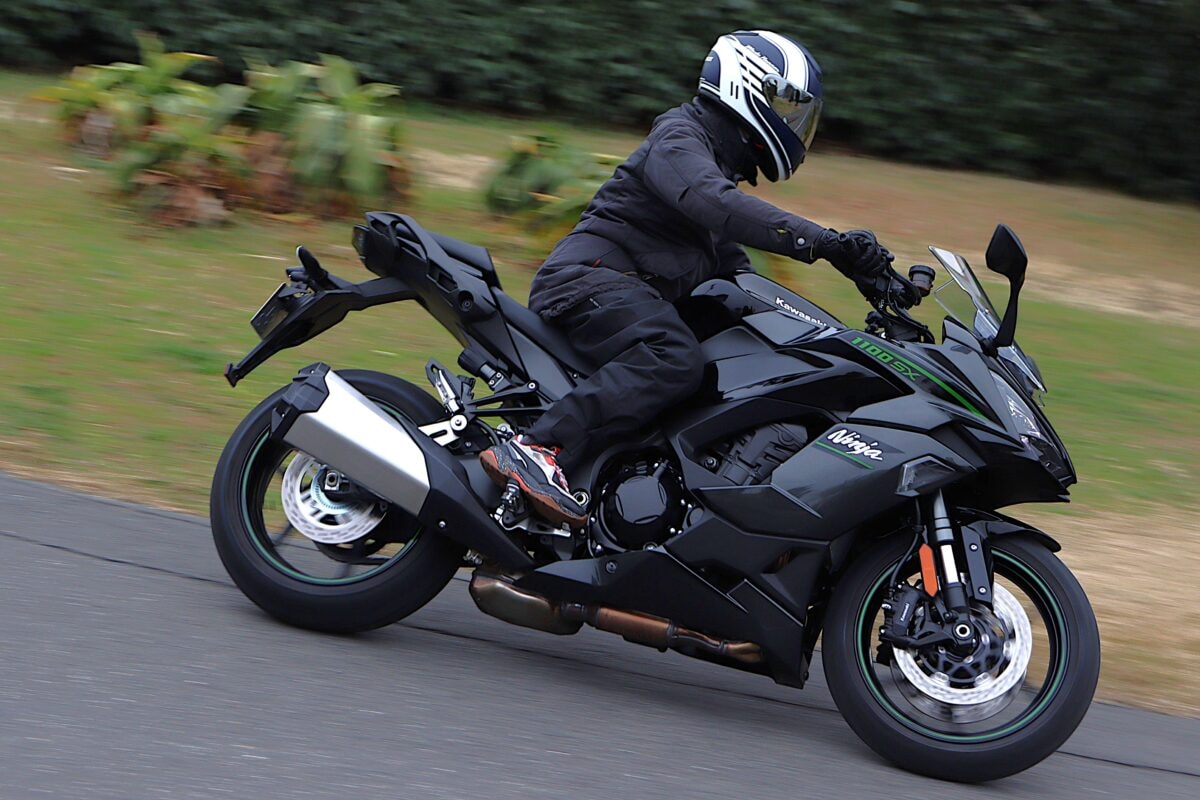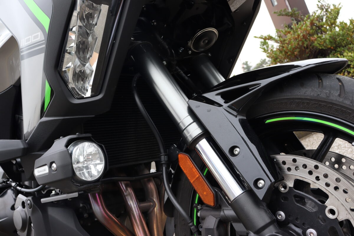 街乗りだと重量は感じるが走行安定性は高く、トルクフルなエンジン特性による扱いやすさ、ギヤチェンジのしやすさはヴェルシス1100SXとほぼ同等。ライポジが前傾すぎないため低速走行もラクにこなせるのでフルカウル初心者にも安心できる。サスは少し固めか? と感じる場面もあったが、路面の凹凸をしっかり吸収してくれて、跳ねるような挙動はなかった。