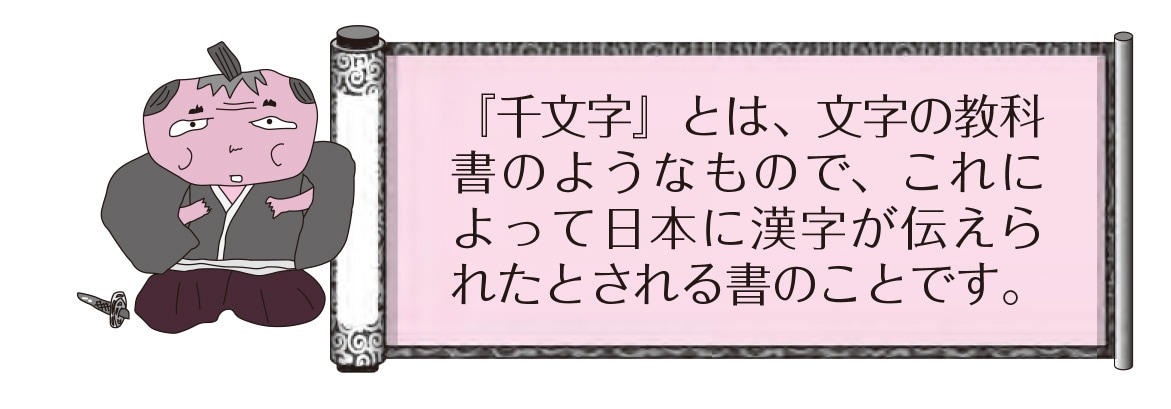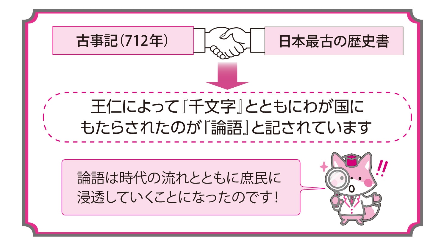 日本最古の歴史書として知られる『古事記』(七百十二年)によると、応神天皇の時代に百済(くだら)から渡来した、王仁(わに)によって『千文字』とともにわが国にもたらされたのが、『論語』であったと記されています。