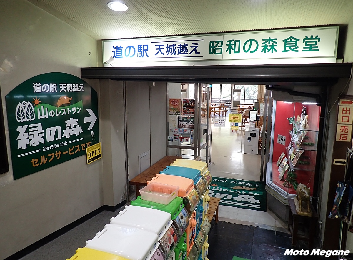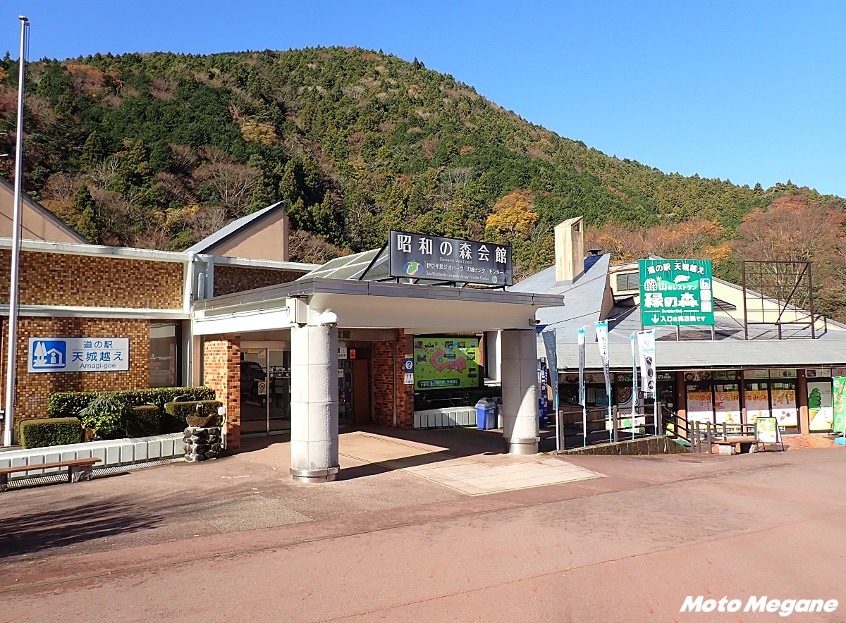 『道の駅 天城越え』は伊豆半島の中央部を通る国道414号沿いに位置。道の駅の敷地内には、昭和の森会館、売店、レストラン、お土産店などがある。伊豆半島の土産品などが揃う売店と、わさび生産農家の直営店では天城産の生わさびやわさび漬けなど手作りのわさび加工品を販売。予約制で、わさび漬け作り体験や生わさびの収穫体験もできる。地元のお母さんたち手作りの惣菜などが並ぶ惣菜店では、漬物や生わさびやしいたけなどの特産品も販売。しいたけコロッケや、山菜おこわが人気で、11月から5月連休までの期間限定で「わさび葉コロッケ」も販売する。レストランでは、ワサビや猪肉、鹿肉など天城の食材を使った料理を楽しめる。
