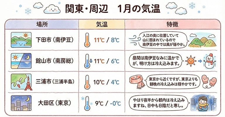 こんなふうに、南伊豆・南房総・三浦半島は冬でも比較的過ごしやすいエリア。