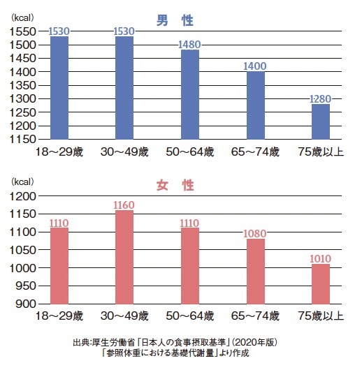 下記のグラフが示す通り、男女ともに30代から徐々に基礎代謝量が減っていきます。基礎代謝量が減ると脂肪を燃焼しにくくなり、脂肪がたまりやすくなります。