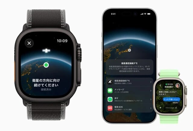 携帯通信やWi-Fiの圏外地域でも衛星経由でメッセージ送信が行なえる新機能。iMessage、SMSでのテキストや絵文字などの送信が可能。対応するiPhone 14以降、Apple Watch Ultra 3なら圏外地域で「衛星の方向に向け続けてください」と衛星接続を促してくれる。