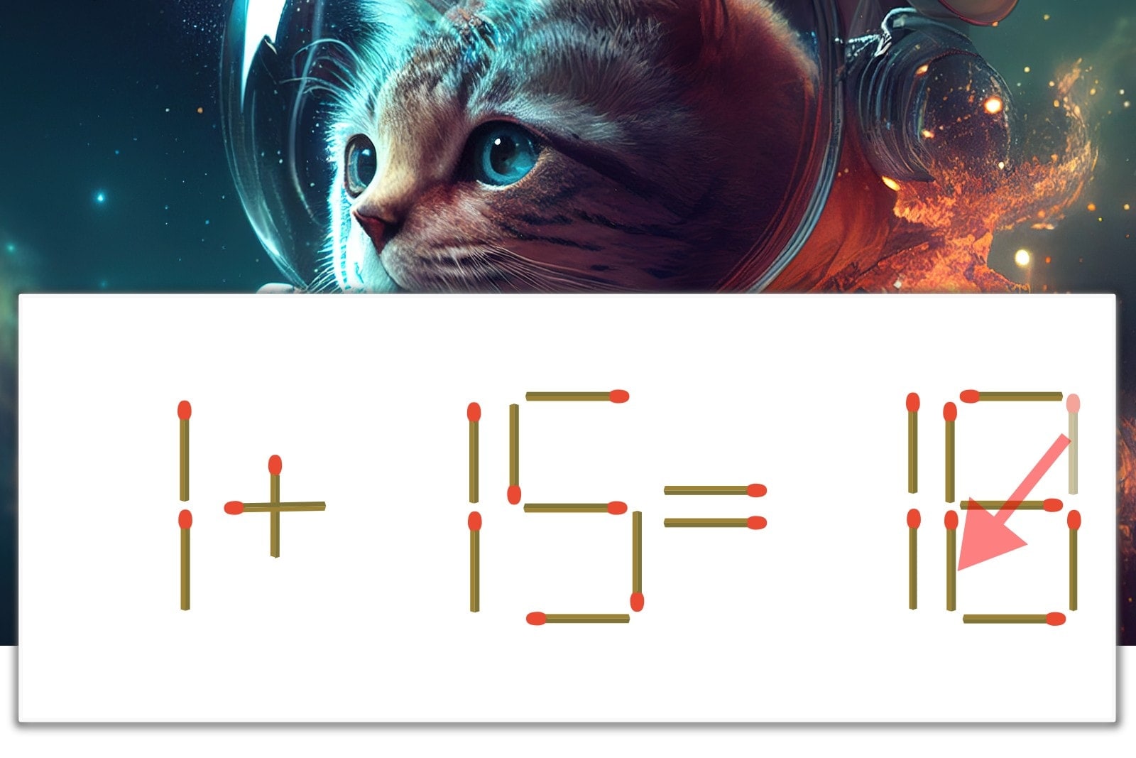 「9」を別の数字に変化させると答えが導き出せます。「9」のマッチ棒を1本移動して、「9」を「6」にしてみましょう。すると、「1+15=16」が成立します。