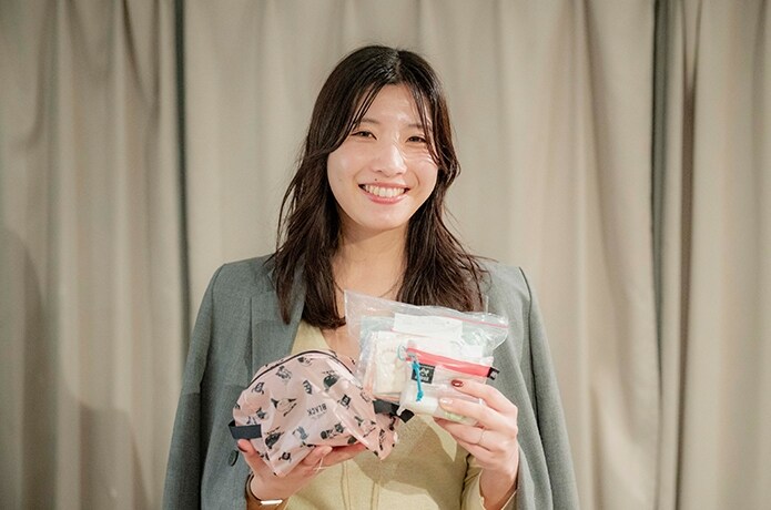 まつ毛のために3種類も持っていくの!?という驚きの声があがる中、「前髪へのこだわりが強くて、アイロンも前髪専用のあぶらとり紙も持っていきます。」と話してくれたのはらんかさん。