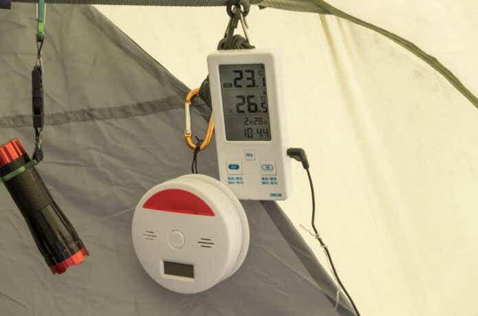 一酸化炭素チェッカーを設置するときは、テントの上部などの頭より高い位置に設置するのがポイント。