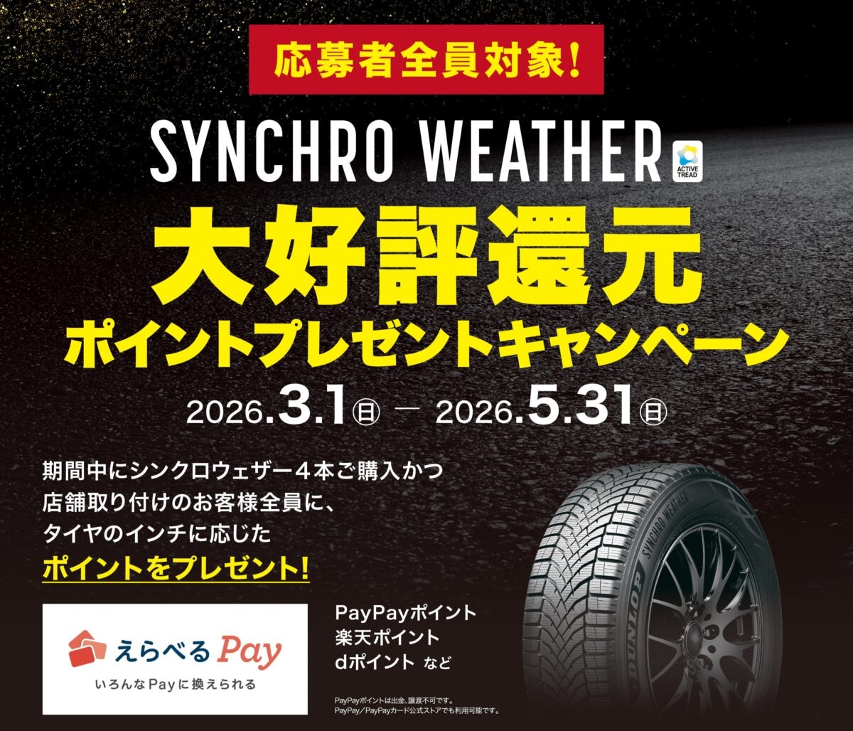 住友ゴム工業株式会社は、次世代オールシーズンタイヤ「SYNCHRO WEATHER」の購入者を対象とした『SYNCHRO WEATHER大好評還元ポイントプレゼントキャンペーン』を2026年3月1日から実施すると発表した。