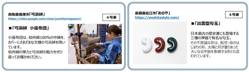 今回の山陰コースのコンセプトは「GINGA SANIN ミュージアム」です。車内には、鳥取県境港市の「弓浜絣」の小座布団や、島根県松江市の「出雲型勾玉」など、地域の歴史を肌で感じられる伝統工芸品が展示・使用されます。