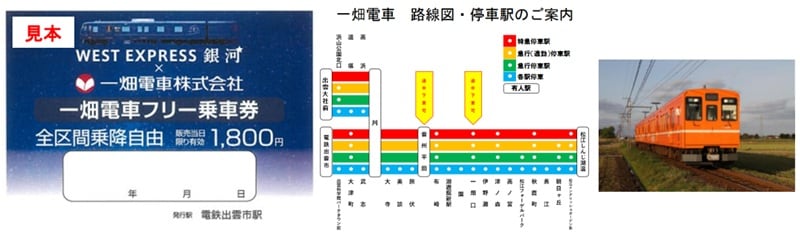 このほか、「ばたでん」の愛称で知られる一畑電車とのコラボ乗車券を期間限定で発売します。一畑電車の「1日フリー乗車券」に「WEST EXPRESS 銀河」のイラストをあしらったデザインで、一畑電車 電鉄出雲市駅で販売します。