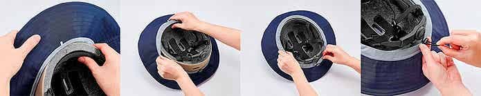 2:帽子のフチをヘルメットのフチにかぶせていく。