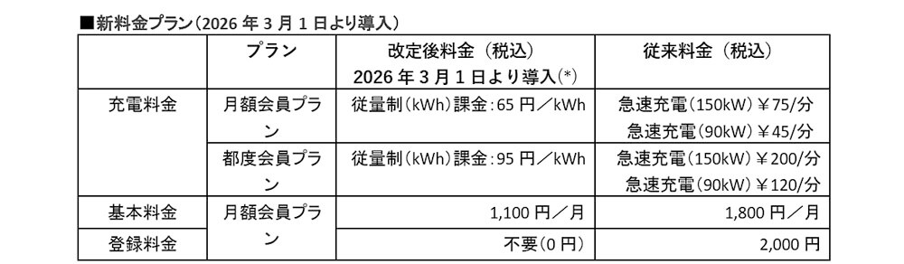 同時に、月額会員プランの基本料金を従来の1800円から1100円へ大幅に引き下げ、登録料金を撤廃(無料化)することで、BEV(電気自動車)所有のハードルを下げ、より多くのユーザーに快適な充電環境を提供できるようにしている。
