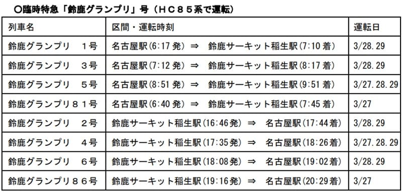 以下の列車が鈴鹿サーキット稲生駅に臨時停車します。