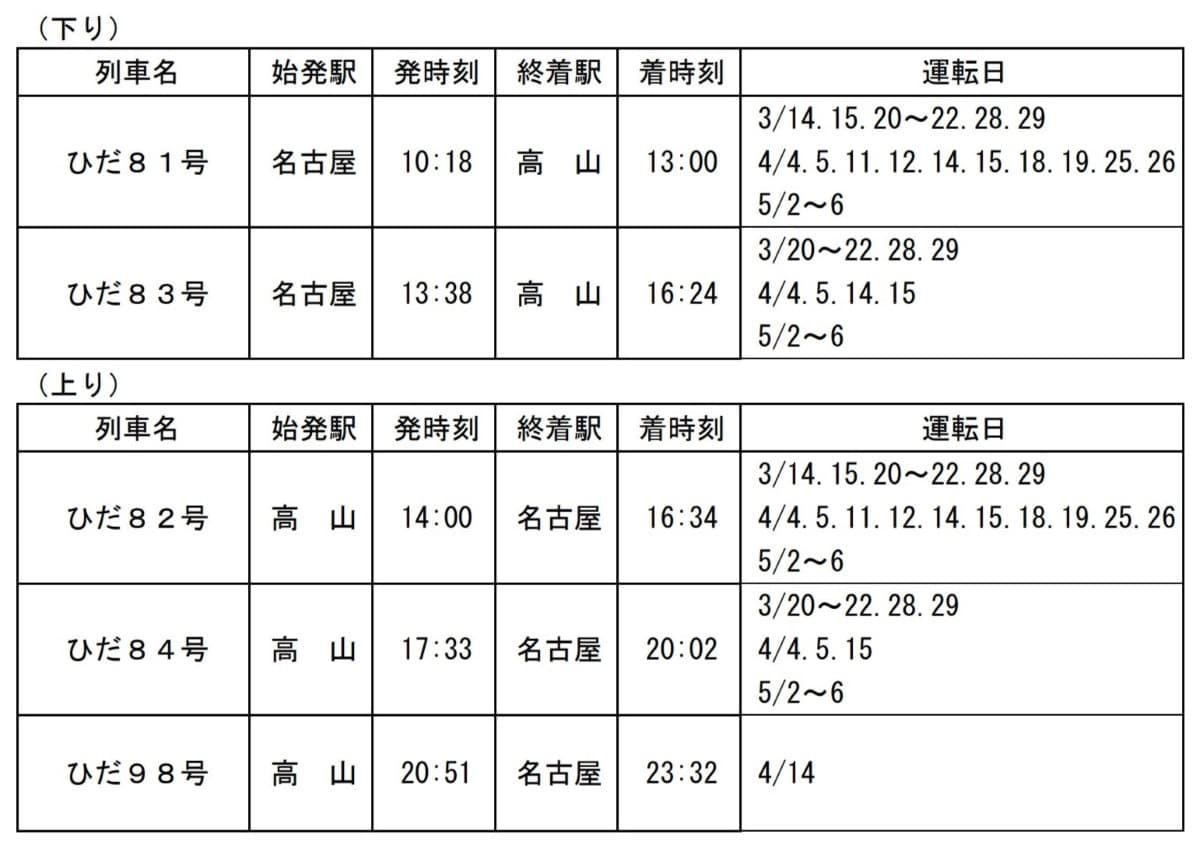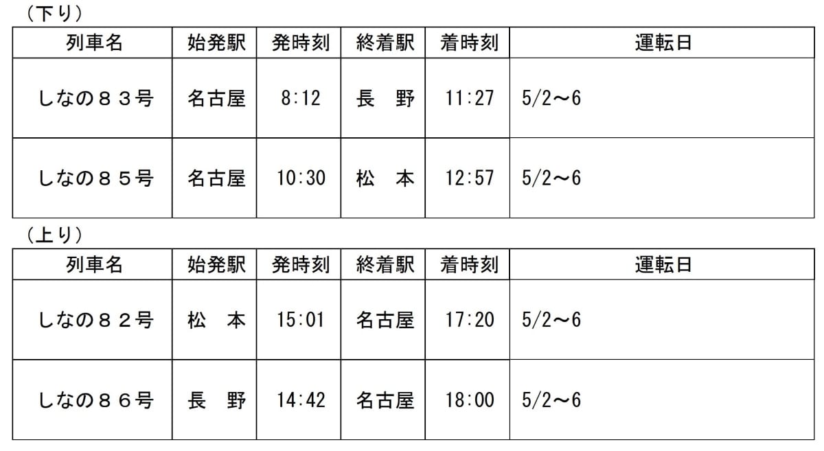 在来線でも、行楽に便利な臨時特急列車を多数運転します。GW期間(4月24日~5月6日)は、新幹線と同様に臨時特急「しなの」「ひだ」「南紀」が「全席指定席(自由席設定なし)」となるため、早めの予約がおすすめです。