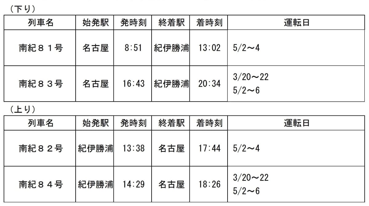 3/26(木):南紀1号、3/27(金):南紀1・3号、3/28(土)・29(日):南紀1・3・8号