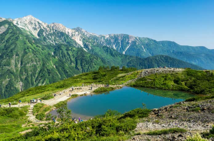 八方池は水面に白馬三山が映し出される、とても美しい景勝地です。ここから唐松岳へ向かう登山道には高山植物もたくさん咲いています。