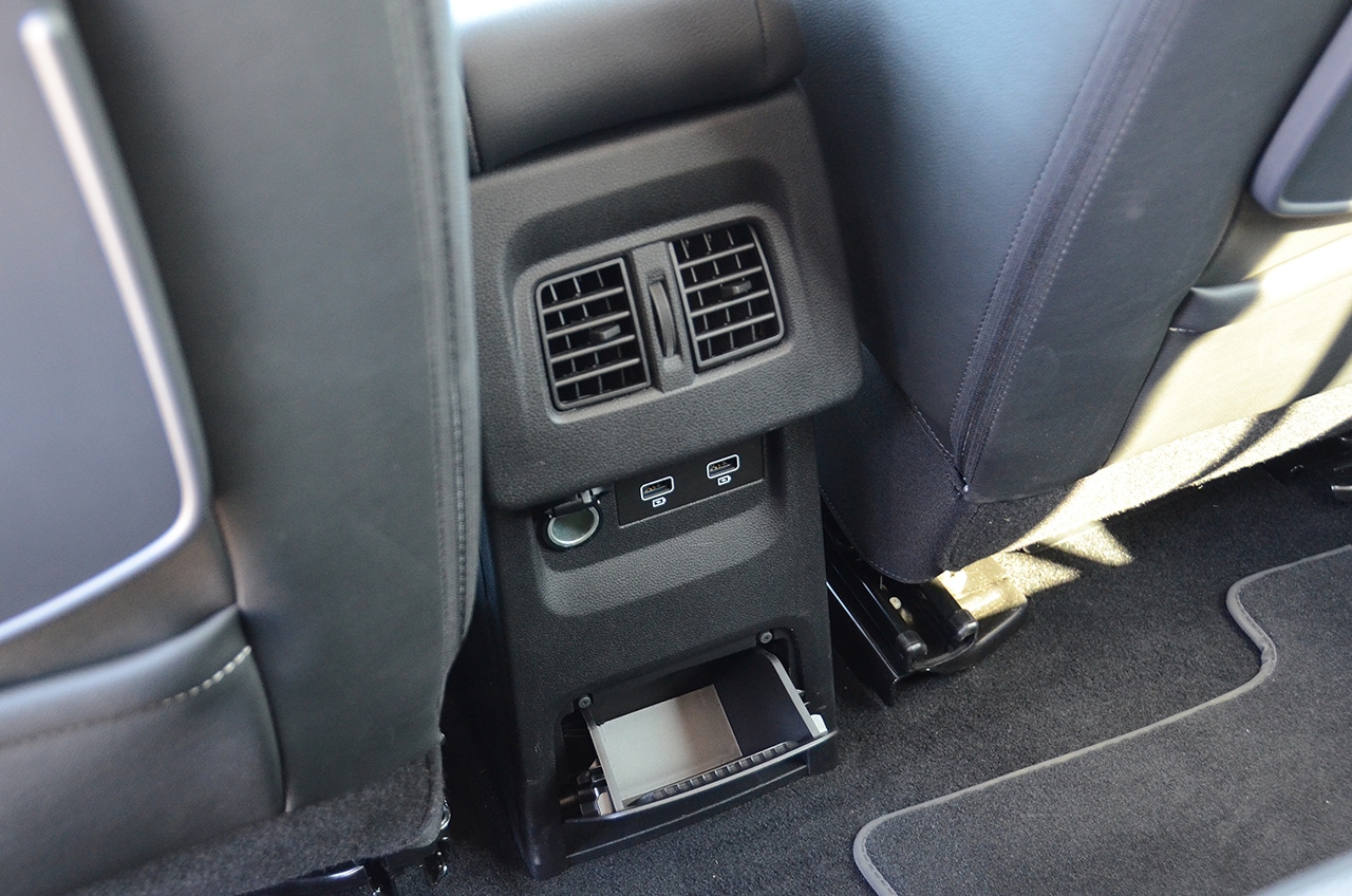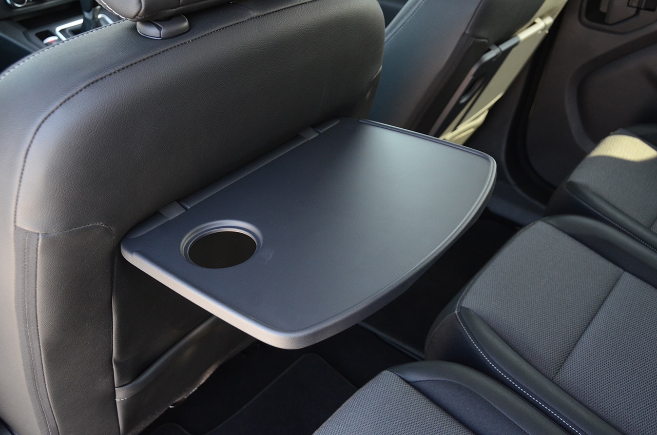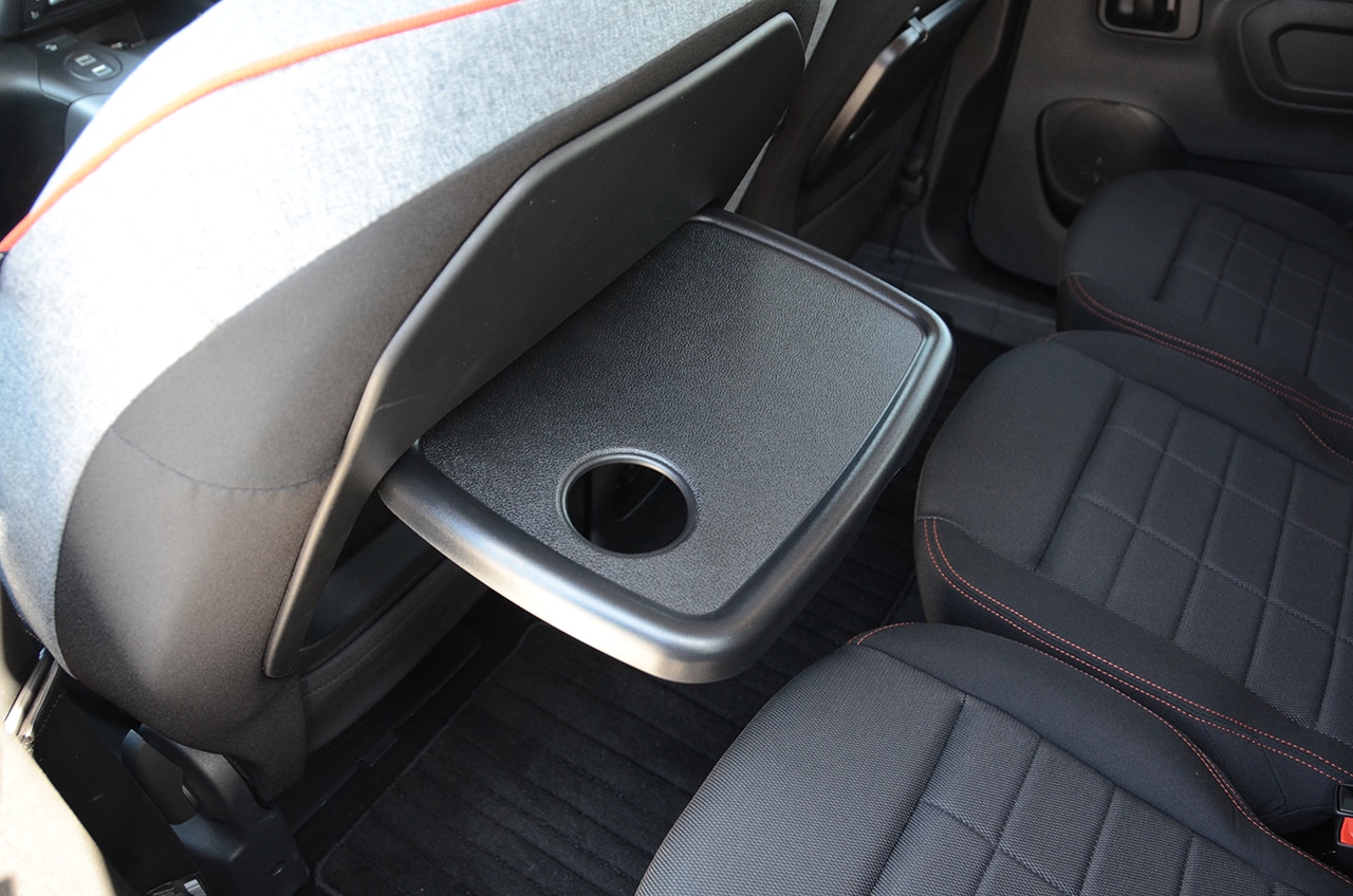 2列目センターシートはダイブダウン式とシートバックだけ倒れるタイプの違い。また2列目にはトレイも装備されるがどちらも華奢なつくりで軽い物しか置けない。