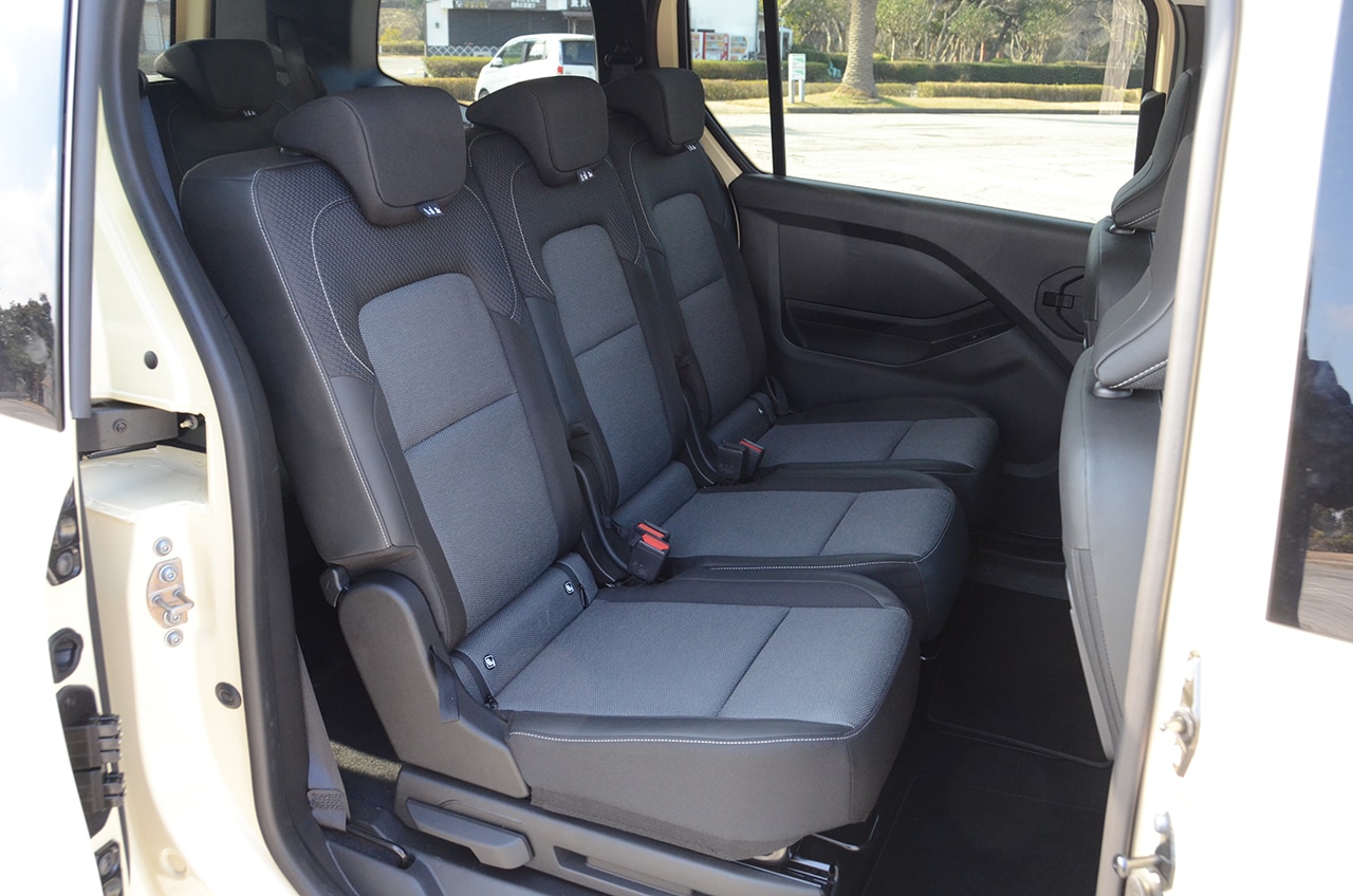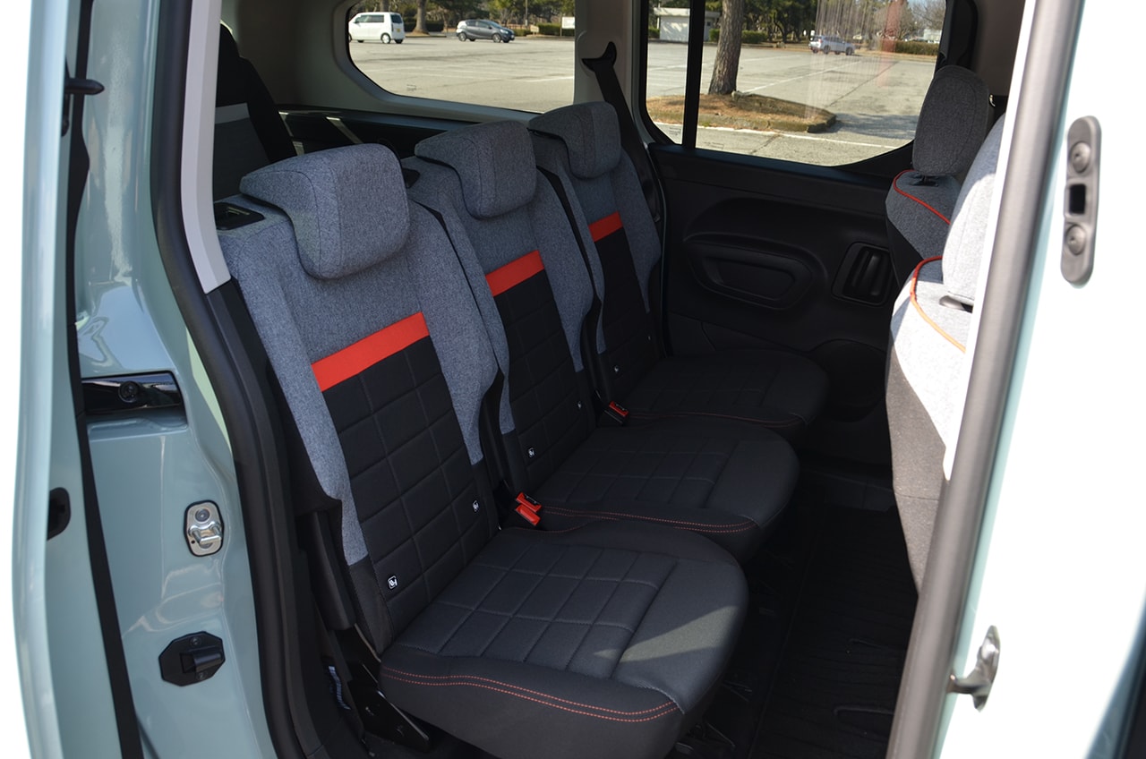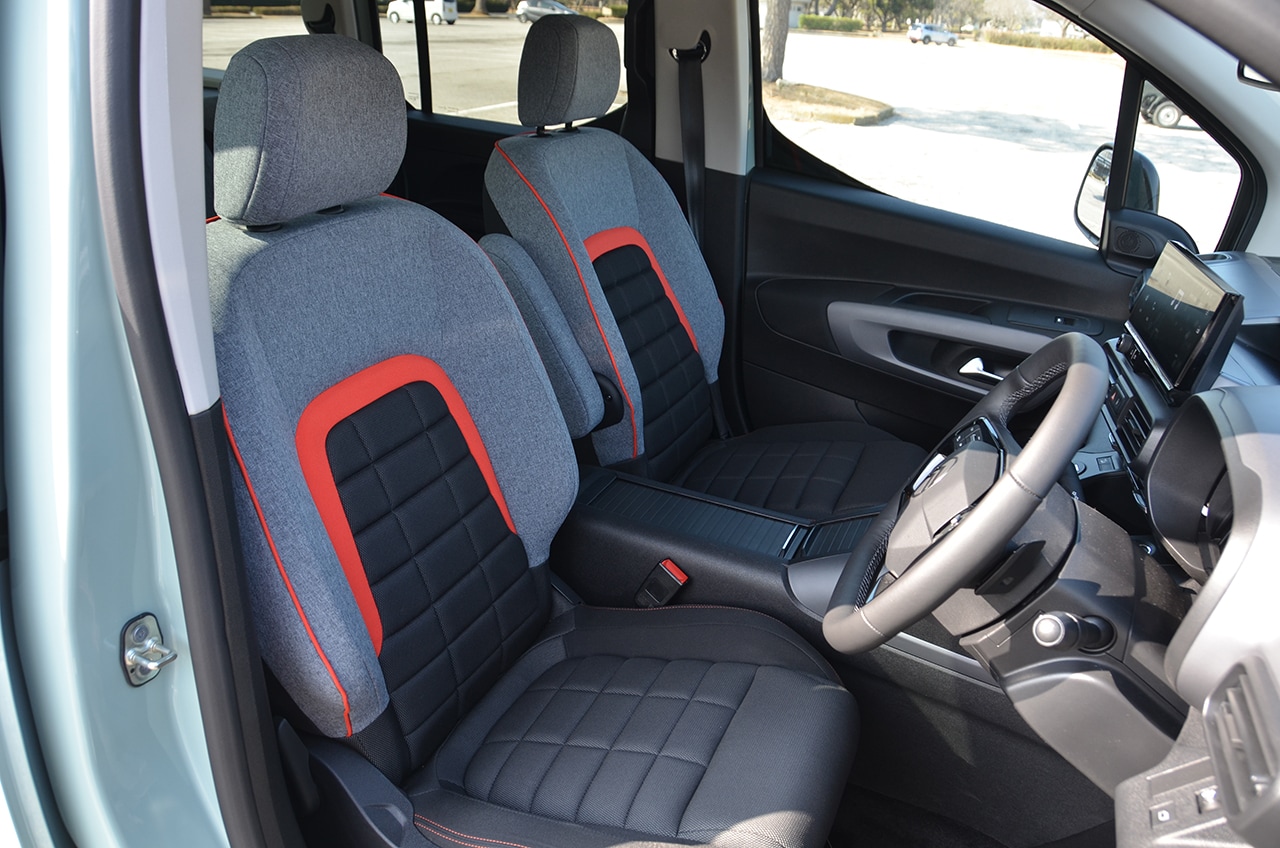 グランカングーは商用車を意識した外観だが、インテリアは快適な仕様で乗用ライク。またシトロエンはデザインへのこだわりがシートデザインにも出ている