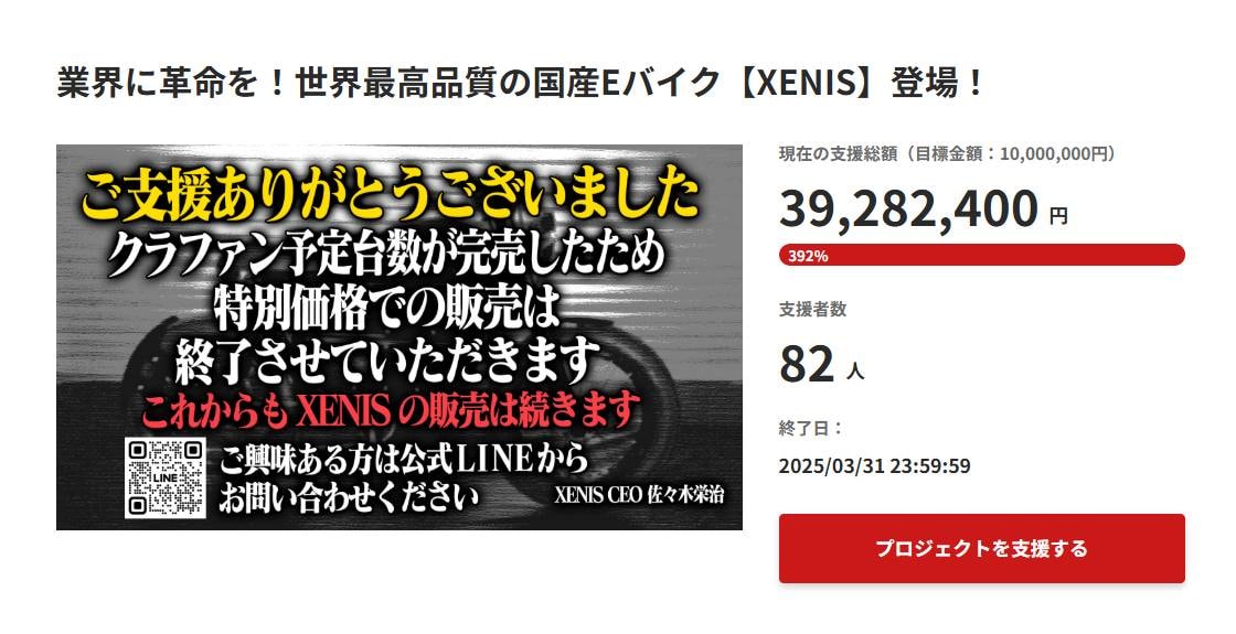 XENISは、溝口勇児が出資・経営参画しており、「堀江貴文」(登録者数218万人)・「三崎優太」(同118万人)・溝口の3名がチェアマンを務める経営エンターテインメント番組「REAL VALUE」にも出演していました。クラウドファンディングは自社サイト上で実施され、限定80台のEバイクを販売。その後の公式プレスリリースでは「開始12日で80台完売、支援総額約4000万円」と発表されていました。