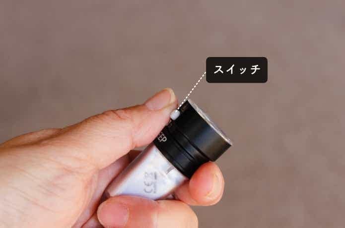 スイッチを1回クリックすると、弱光→中光→強光→点滅の順に光り、長押しで消灯します。