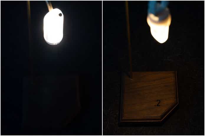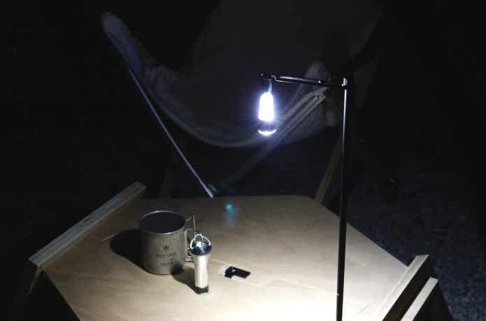 続いて、ランタンハンガーに吊るしてテーブルを照らしてみました。明るさは見てのとおり、卓上全体をムラなく照らせたので、食事や作業中も手元がしっかり見えましたよ。