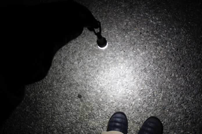 今度は手に持って足元を照らしてみると、照射範囲がしっかり広く、歩く先を安心して確認できました。