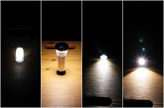 (写真左より)「GD3」、ゴールゼロ「ライトハウスマイクロフラッシュ」のランタン点灯モード、「GD3+KZ1」、ゴールゼロ「ライトハウスマイクロフラッシュ」の懐中電灯モード