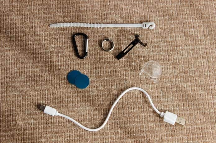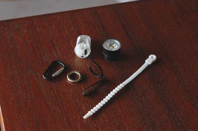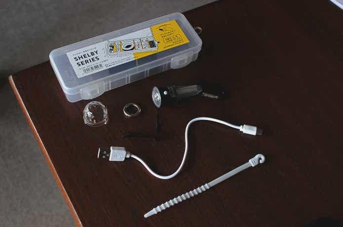セット内容はこんな感じ。GD3とKZ1のほかに、シリコーン結束バンド・カラビナ・丸型カラビナ・金属製クリップ・粘着剤付き鉄板(使いかたは別途紹介)・透明LEDシェード・USB充電ケーブル・取扱説明書が入っていました。