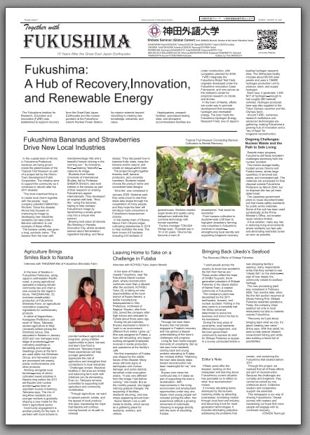 神田外語大(千葉市)の学生が、福島県内を取材し、東日本大震災からの復興状況を日本語版と英語版にまとめた震災復興新聞「福島とともに(英語版は「Together with Fukushima」)を、震災発生から15年を前にした3月4日、東京・霞が関の復興庁で瀬戸隆一副大臣に手渡した。