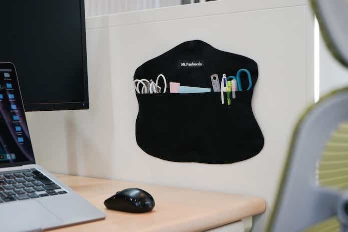 デスク周りで、筆記用具やコード類をまとめておくのも便利。私物の置きっ放しがNGなオフィスでもさっと外して持ち帰れますね。